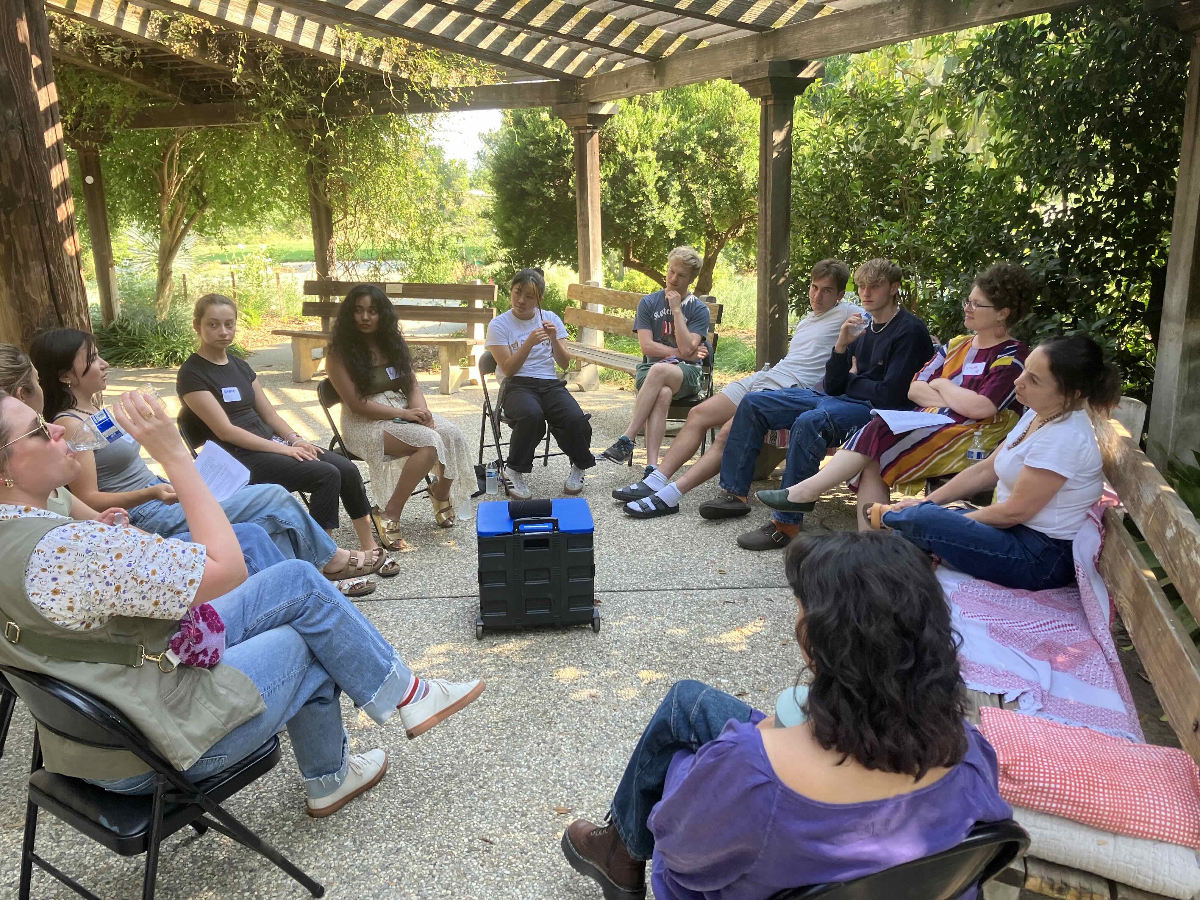We began by listening to audio clips from the IA Hubbub podcast featuring Patwin/Wintun cultural practitioner Diana Almandariz. Opening with a listening allowed people to sit back and take in the teachings which introduced the concepts we were going to explore. The clips discussed the Tending and Gathering Garden (TGG) in Woodland, where the local Native American community is working with the Cache Creek Conservancy to revive the area’s native habitat, and the cultural burns that they practice. When they do burns, nature responds. Deer bathe in the warm ashes, insects emerge, and birds swoop in to feed. It is a beautiful example of how humans can fit into ecological systems, supporting them and being supported by them. The podcast also grounded us in our local environment as Patwin/Wintun peoples are the original peoples and stewards of the land we were gathered on. Then we collectively read out loud the speech, “Clear Thinking: a Positive Solitary View of Nature” by John Mohawk from the book Original Instructions: Indigenous Teachings for a Sustainable Future. Each person read a paragraph of the reading until it was completed. This was a little more participatory and allowed us to hear each other’s voices, creating connection across each other and the texts. After listening to the teachings from multiple Indigenous voices, we spent time individually reflecting by jotting responses to the following reflection questions: