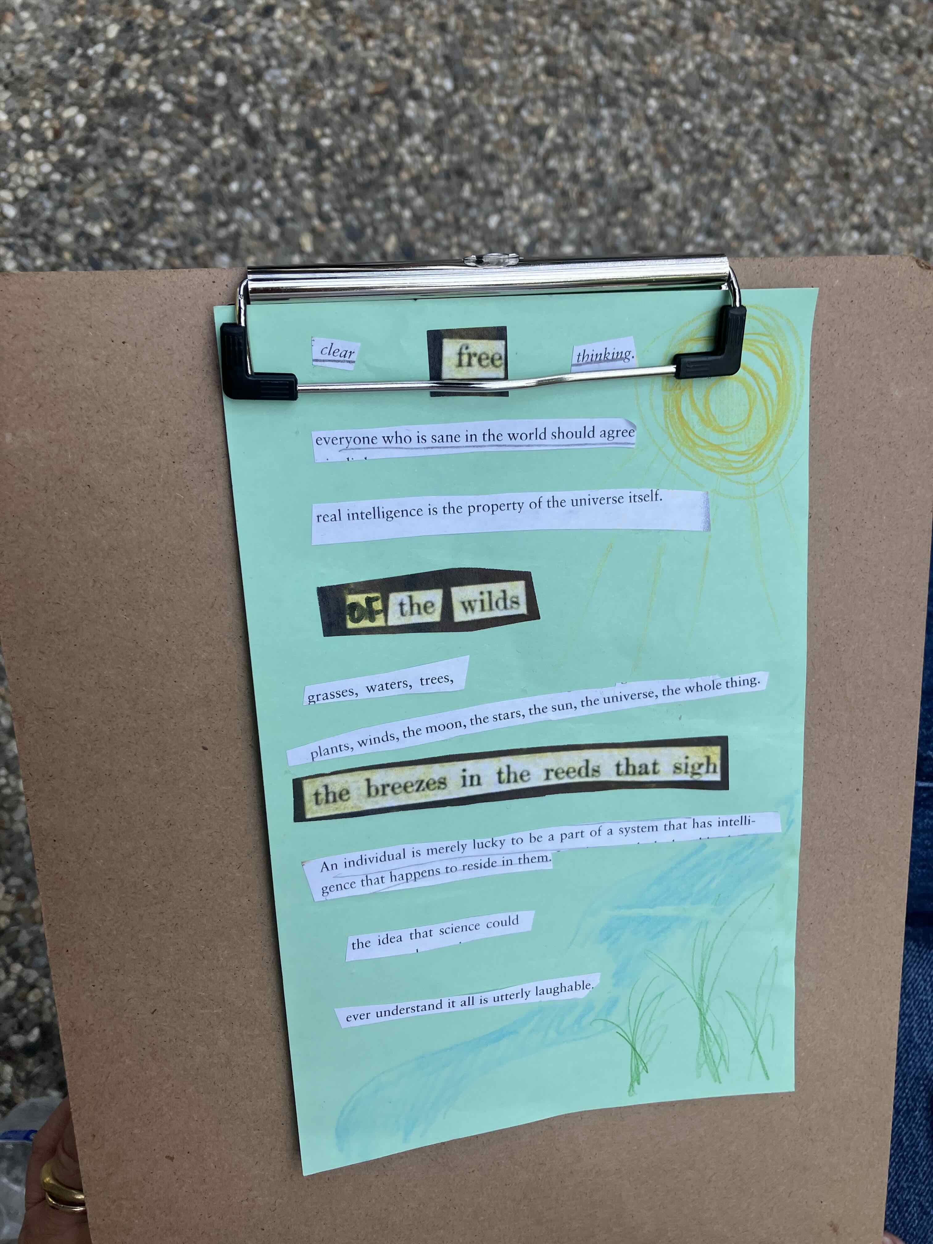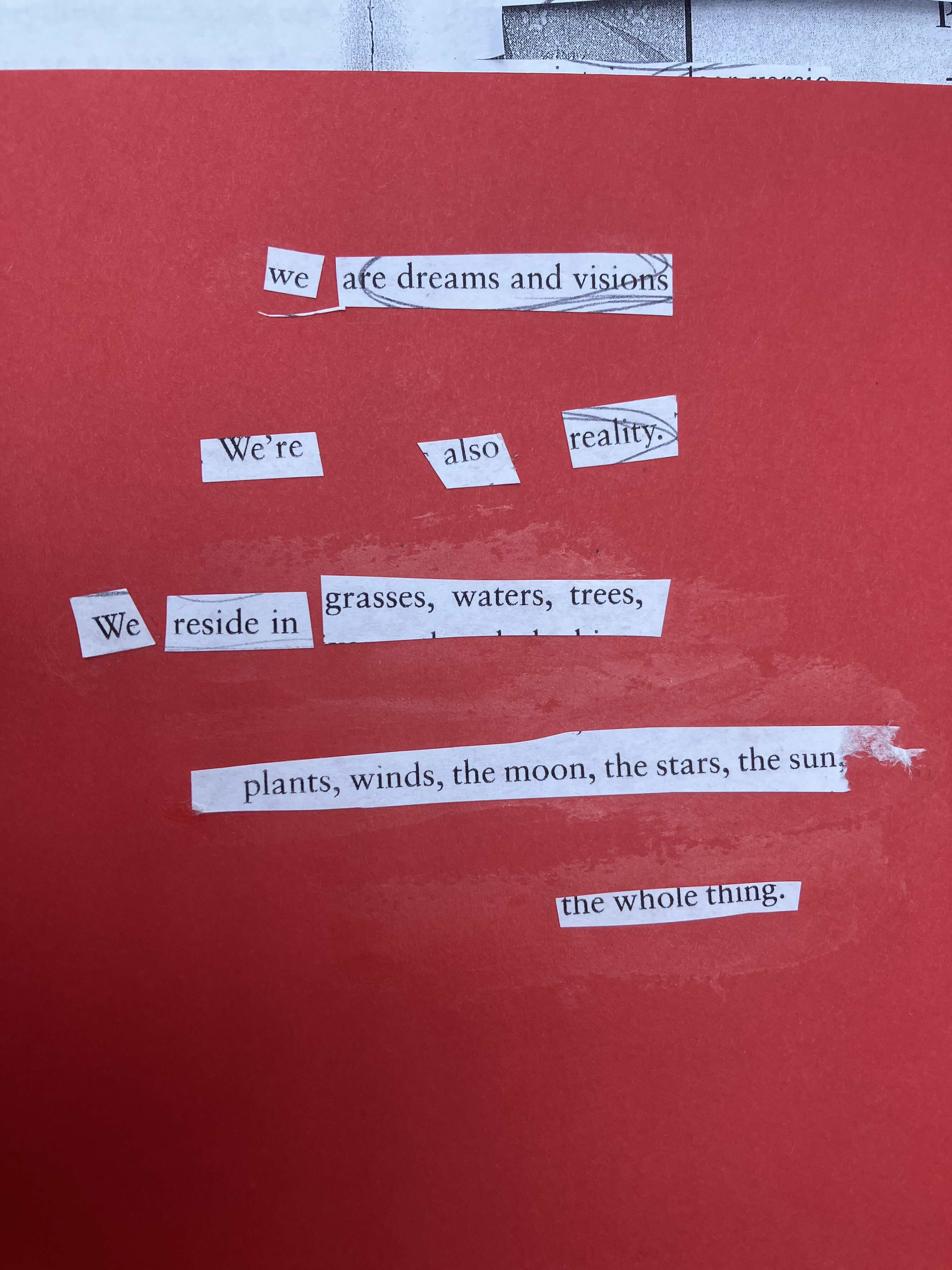 The last part of the event included creative artmaking with cut-up poetry. Cut-up poetry is cutting out words or phrases from a text and re-piecing them together to create a poem. After receiving so much information, creating cut-up poetry invites us to process and reflect on what we learned in a hands-on and creative way. People seemed to really enjoy the process of searching for and creating the poems, and many volunteered to share theirs at the end. Our poems reflected connection to the Earth, acknowledged how little of nature we could really understand, and honored the knowledge and sacredness of the universe. It was touching to hear through the poetry how the teachings impacted people, and many of us chose similar language from the readings.