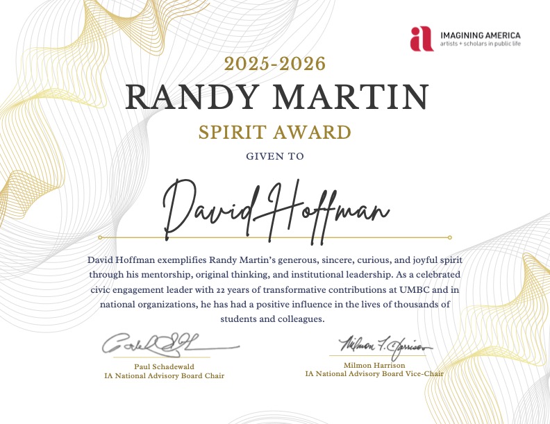 David Hoffman is the founding director of the Center for Democracy and Civic Life at the University of Maryland, Baltimore County (UMBC). The Center creates learning forums in which participants develop the knowledge, skills, and dispositions to build communities in which everyone can thrive. Its work is premised on the idea that civic life encompasses everyday settings and relationships through which people can generate the power to shape their world. The Center, established in 2018, builds on David’s 15 previous years at UMBC helping members of the campus community see new possibilities for themselves and the world.